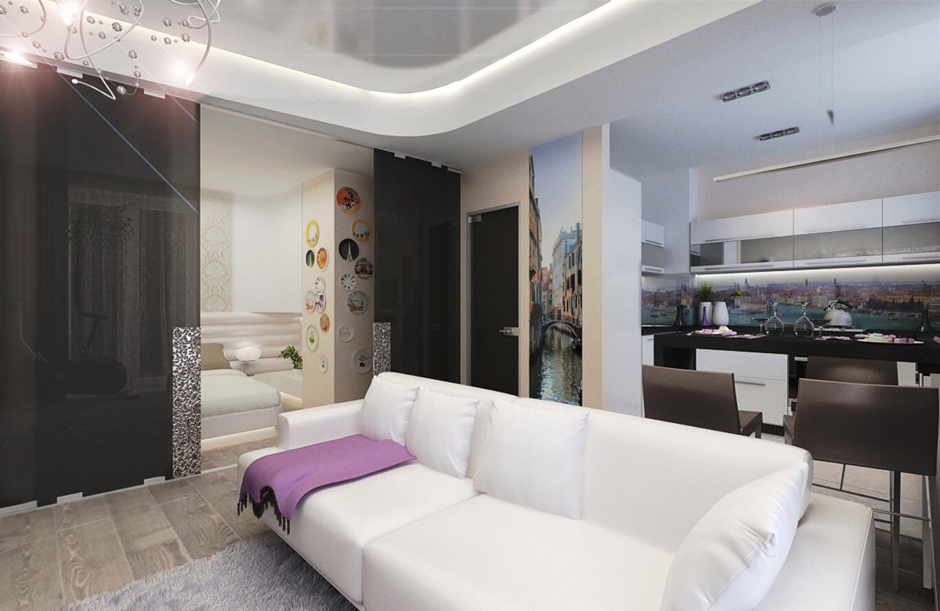 Zoning in the design of the room is 16 sq.m. type of bedroom-living room involves the allocation of a sleeping place behind a partition. This option is often used in small apartments, when not everyone has their own room.