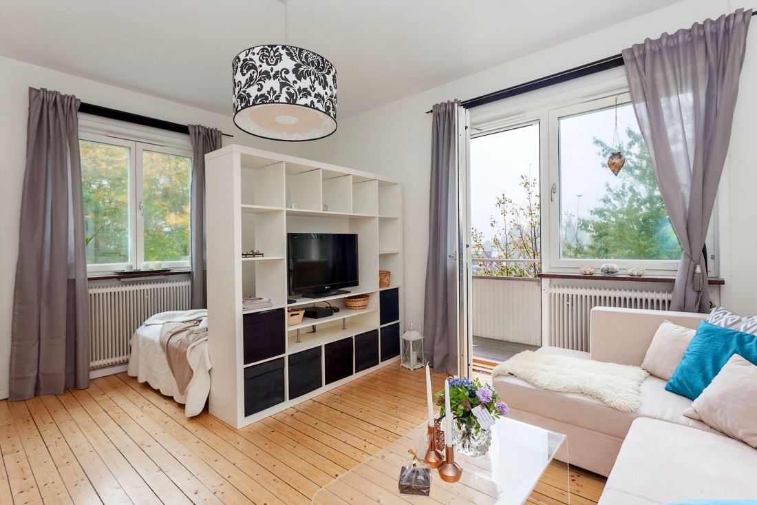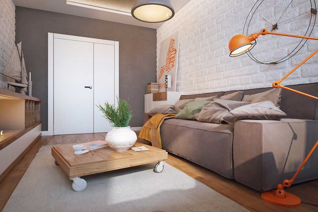 Tip. To prevent multiple pieces of furniture from taking up a lot of space, buy low sofas and armchairs with low backs. A coffee table is best to choose with a glass top. Replace cabinet furniture with original shallow open shelves and double-sided racks. They are recommended to be used as partitions for zoning.