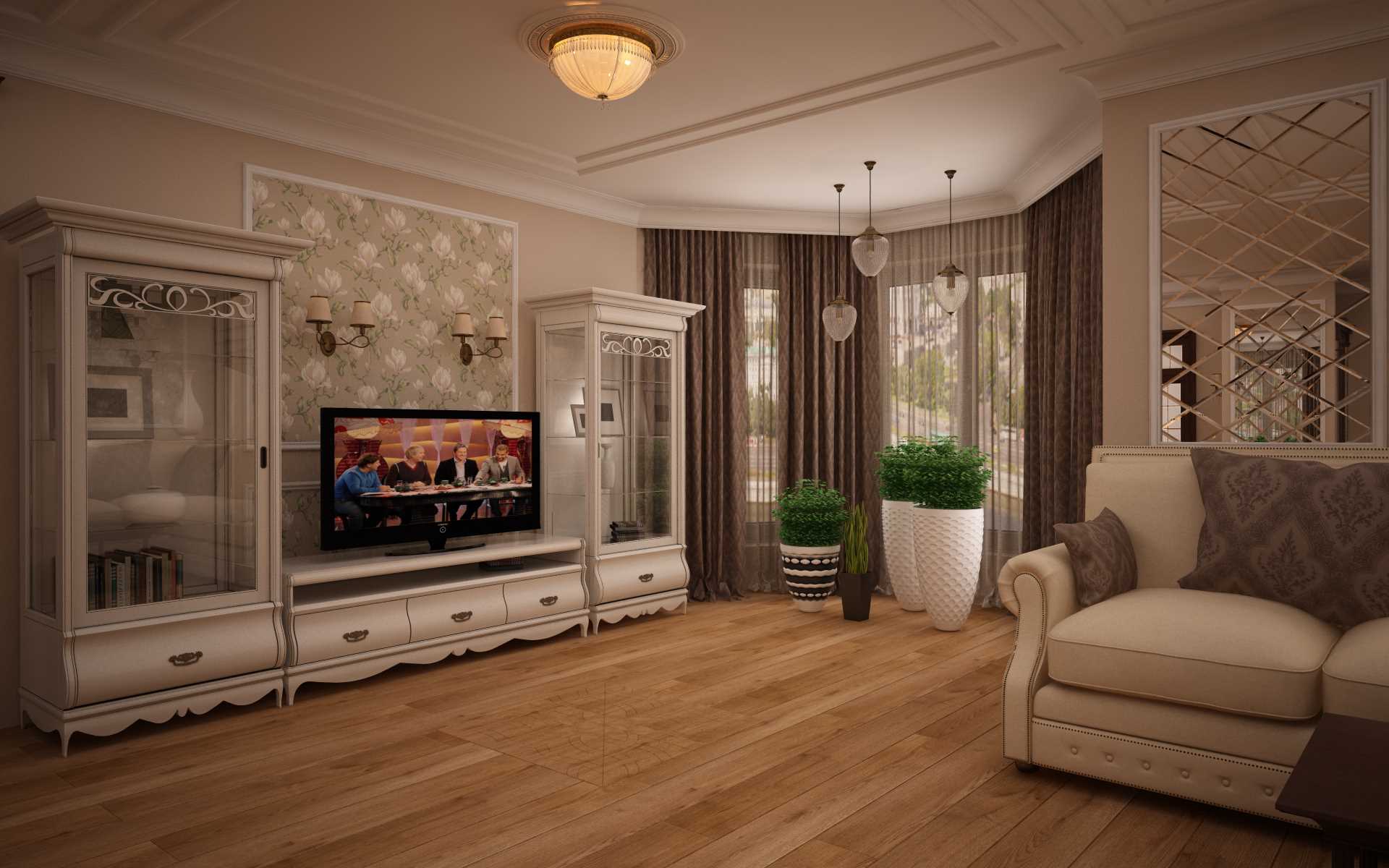 For lovers of nature and home plants, the interior of the living room with a bay window will be a real discovery, as this is a great place for a winter garden or greenhouse. Due to the large number of windows, a lot of sunlight will fall on this site, which is perfect for photophilous plants.