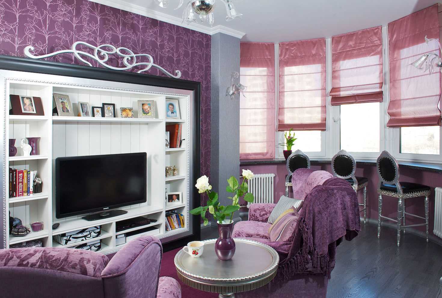 Living room design in purple with bay window