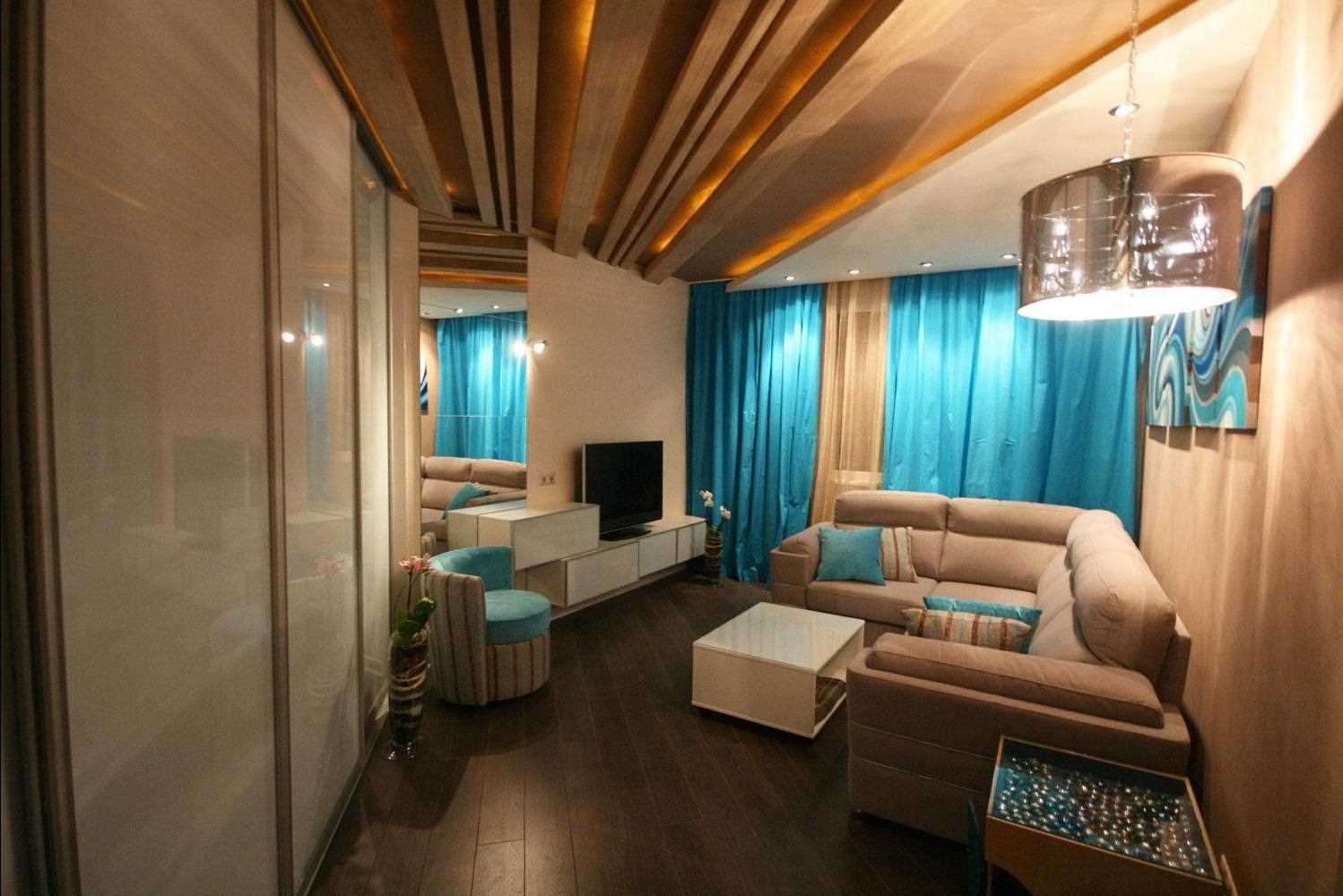 It remains to choose a sofa, and pick up the curtains. It is better to give preference to dark and dense material, so that during the daytime tightly close the windows during viewing.