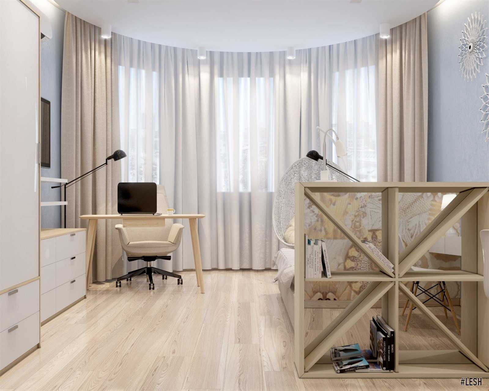 Another solution for using this area is the organization of the workspace. This option is suitable for one or two bedroom apartments. And thanks to the large number of windows, this place will be well lit by daylight, and you will have the opportunity to relax from work and distract ourselves from the surrounding environment, admiring the view outside the window, which favorably affects the work process.