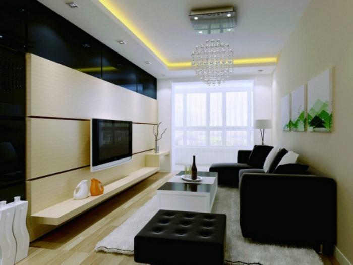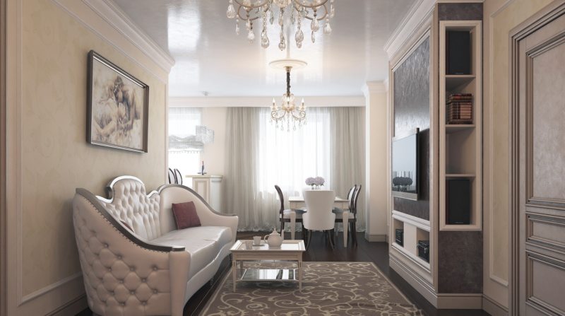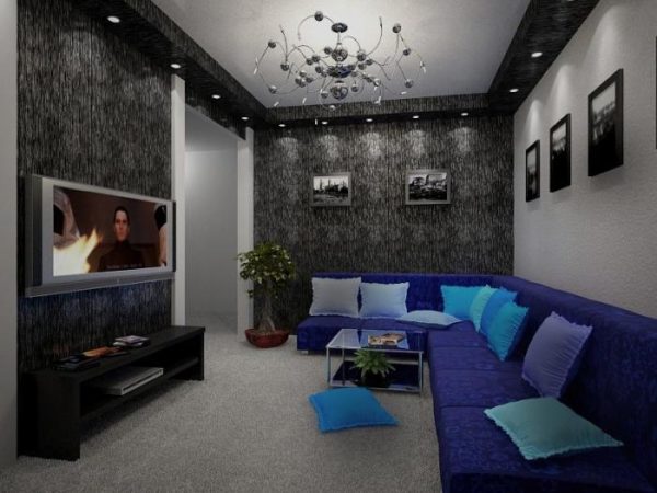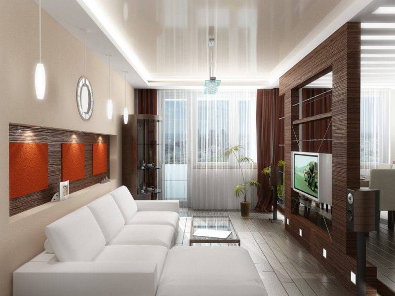 Furniture set near long walls. Moreover, it is as narrow as possible. It is appropriate to use a carpet with stripes parallel to the short the walls. This allows you to visually increase space.