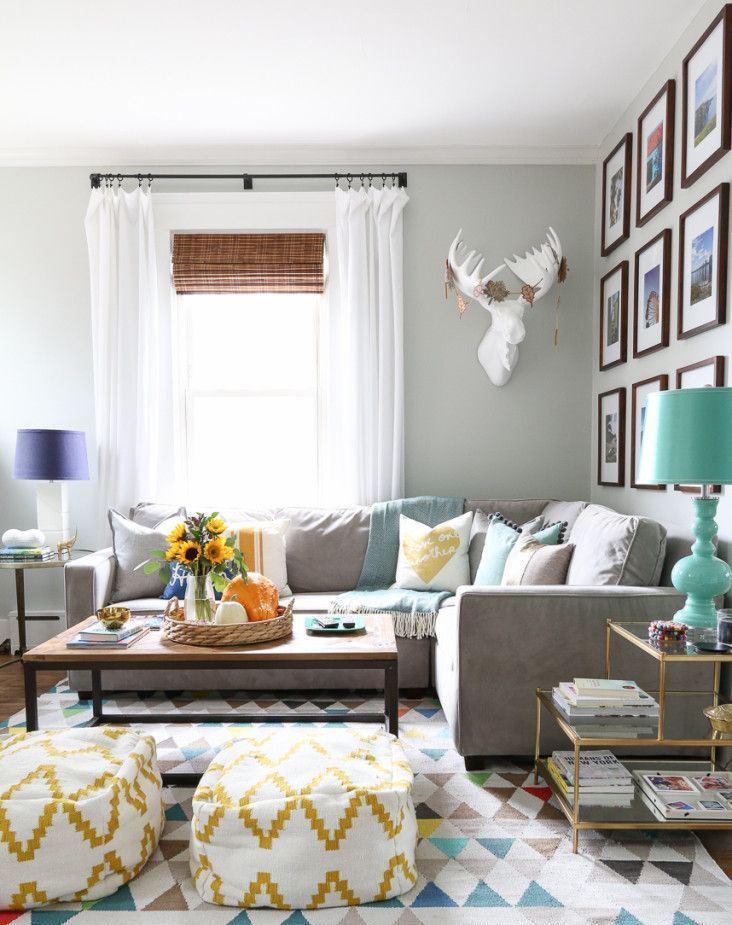 Upholstered furniture must be present. Upholstery is selected matte. Cushions serve as decorative components. Multi-colored products harmoniously laid along the entire length of the sofa attract attention.