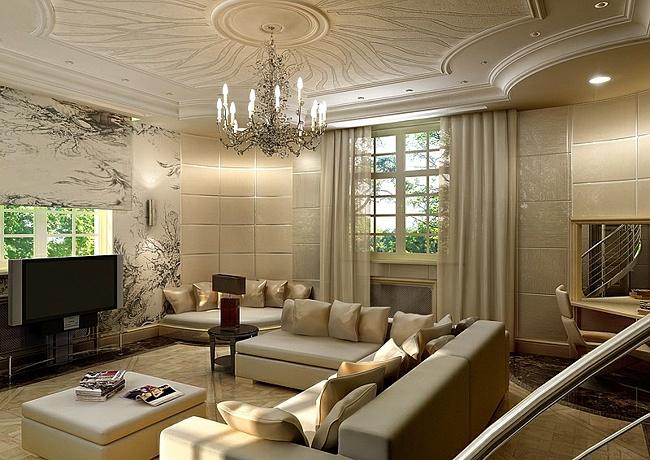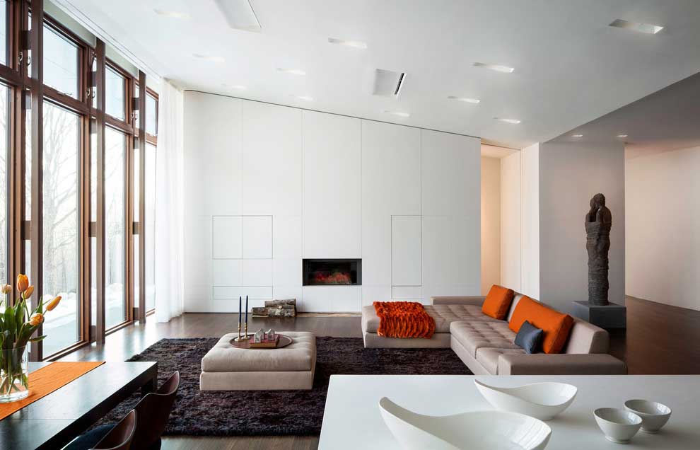 The flooring is finished with a milk laminate having the form of a parquet board. A textured carpet with a fleecy base is always laid under the coffee table. With a standard apartment layout of the rooms, it is better to mount doorways without thresholds. So the design of the living room in a private house will look holistic.