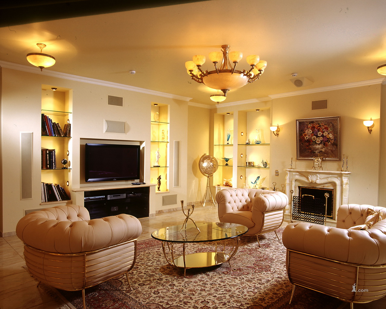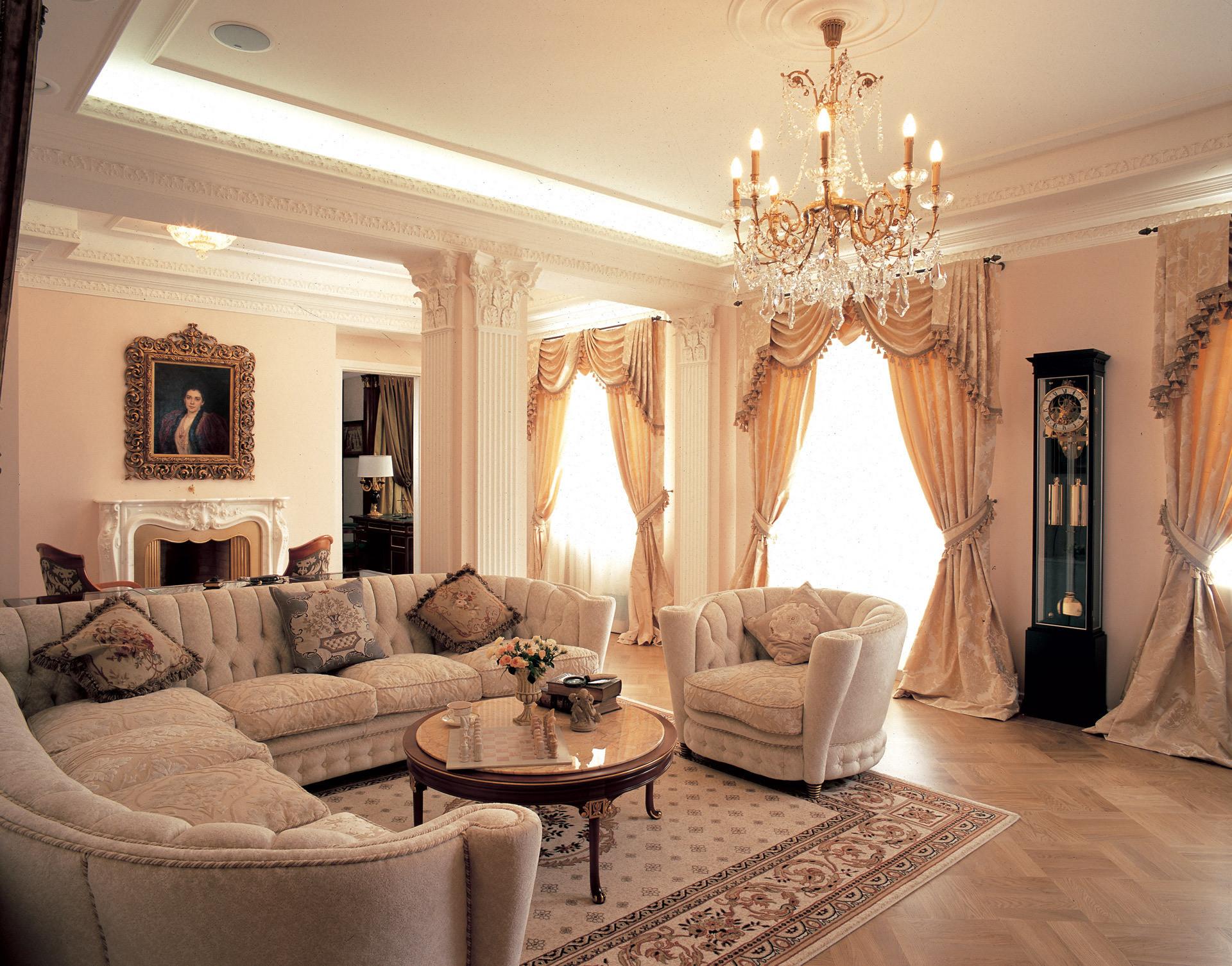 The flooring is parquet. The noble texture of wood, varnished, will be well located here. The place for gatherings is furnished with upholstered furniture: sofas and armchairs with soft upholstery of a peach shade go well with a darker parquet. It will be interesting to organize a certain circle of furniture, in the middle of which there is a coffee table. Under this spot on the floor is a Persian carpet of light brick color.