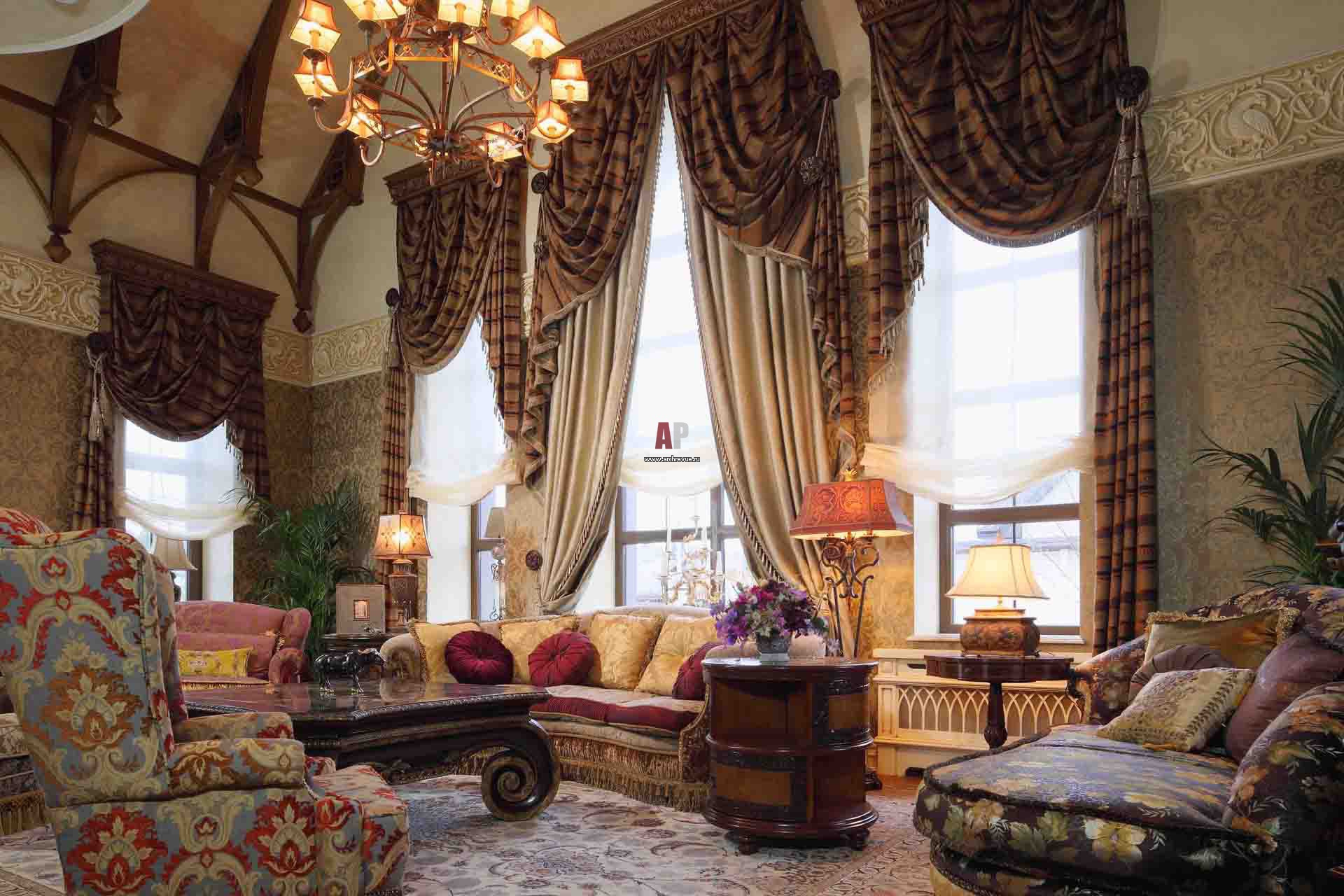 The white interior lends itself perfectly to decoration. Window openings are hung with contrasting textiles. The presence of two curtain elements is mandatory: a translucent curtain, embroidered with small ruffles, harmoniously combines with straight curtains. The texture of the porters should create an attraction to themselves. Therefore, it is chosen with a complex pattern. A satin fabric version without a pattern is also suitable. The emphasis here will be the bright color of the product.