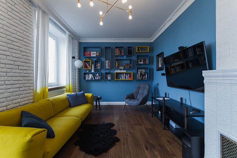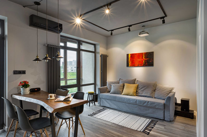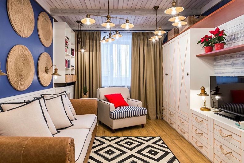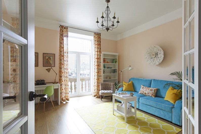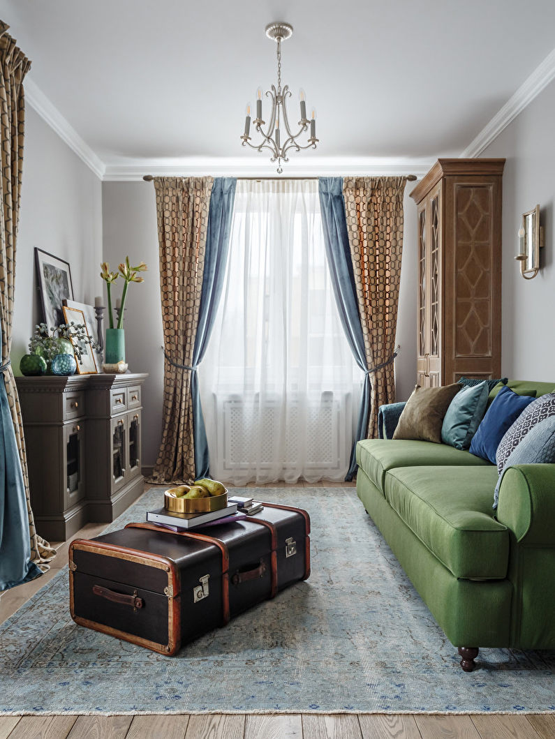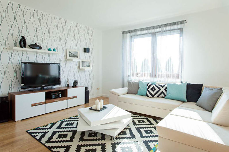The living room can be decorated in a single style or combine several areas in one interior