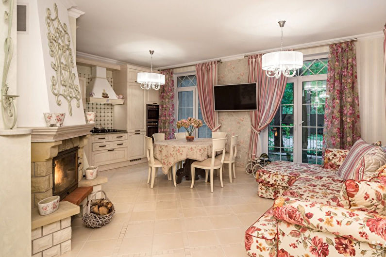 This direction is suitable for lovers of quiet, calm evenings. It will provide an opportunity to create a soft and comfortable atmosphere. Much attention is paid to furniture and textiles. Large soft sofas and armchairs with plenty of pillows. Long draped curtains and soft carpets on the floor. Provence is the embodiment of a cosiness of warmth and luxury.