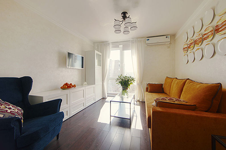 To design a small living room, it is better to choose light colors that visually expand the space