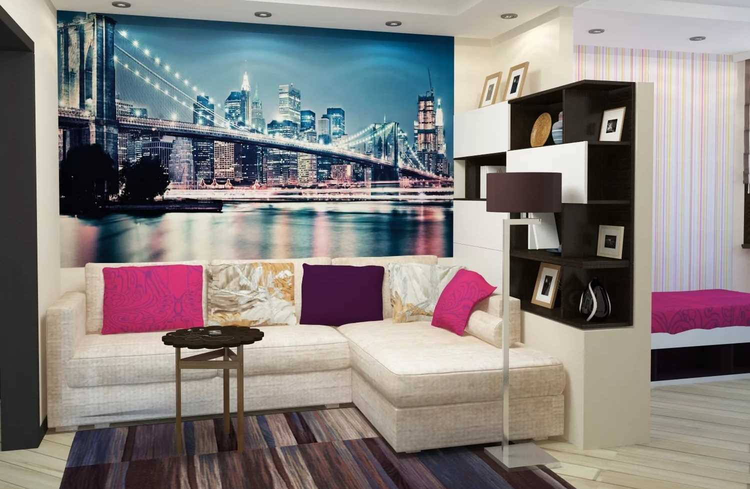 Quite often, the living room has access to a balcony or a loggia. If you combine these two rooms, then the area will increase significantly. Working with such a room will be much more interesting and easier. On the loggia you can easily set a bed and equip a bedroom. As a supplement, put a rug on the wall to place paintings, lamps and more. The result will be a modern room design of 17 square meters. m. with a full living room and bedroom.