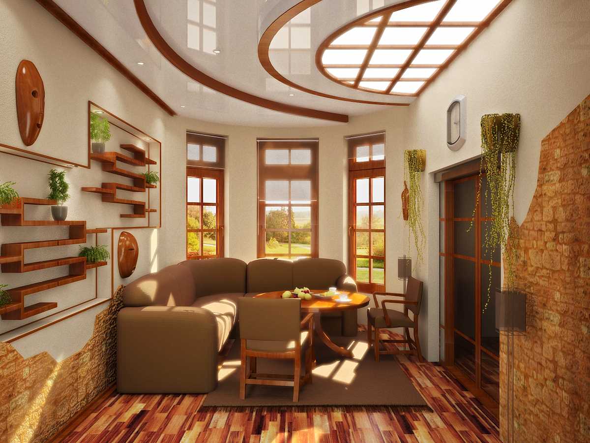 - Eco. Least demanding on the room, looks good in small living rooms. When arranging, natural materials and bright lighting, both artificial and natural, are used. It is good to set flowers and plants, as shown in the photo.