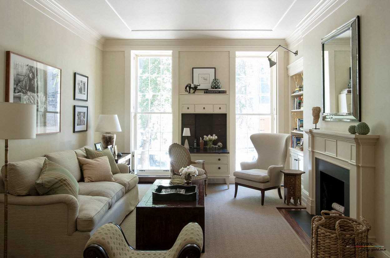 When arranging such a living room, only natural materials are used. This applies to both flooring and furniture. Well complement their material inserts. As for color solutions, these are warm tones. For example, beige, gold and others. Statuettes, mirrors and flowing forms will help emphasize the romantic style. This idea of designing a small living room is shown in the photo below.