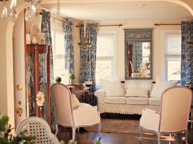 Printed natural cotton fabric curtains look good in the living room. Textiles are usually decorated in white and blue, but variations are possible. The use of pastoral and neoclassical plots is typical.