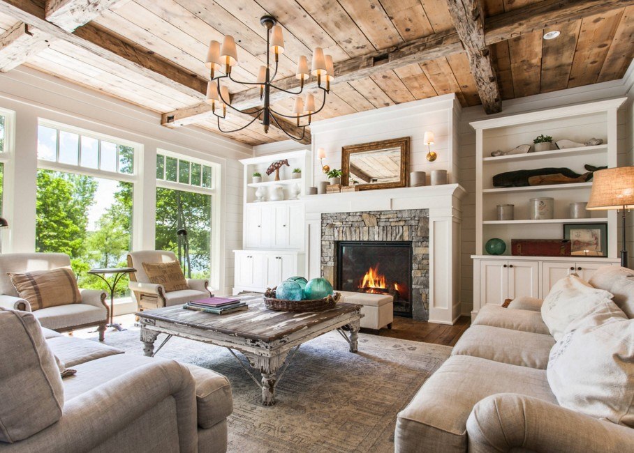The choice of coverage depends on the area of the living room. For a large room, choose a wooden ceiling. The French style involves the use of darkened and faded materials from time to time. But if none were found, a wooden ceiling with skillfully decorated ceilings would do. If desired, the surface can be painted with white or beige paint. Play in contrast, cover the ceiling with a light coloring agent, and leave the beams dark.