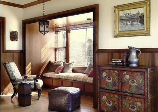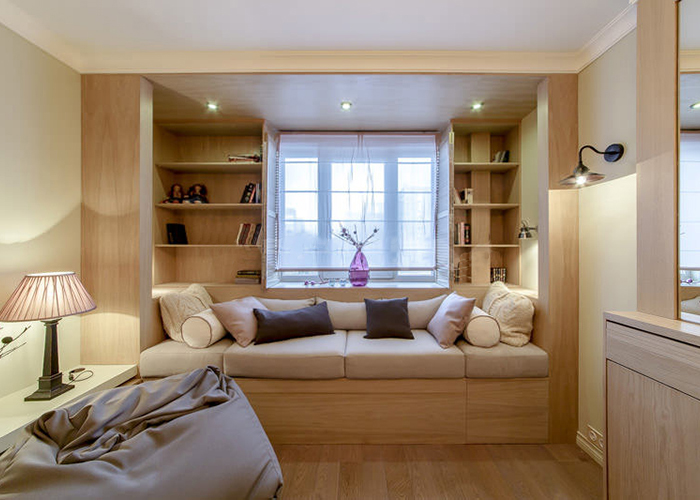 In a small niche near the window you can put a sofa with pillows.