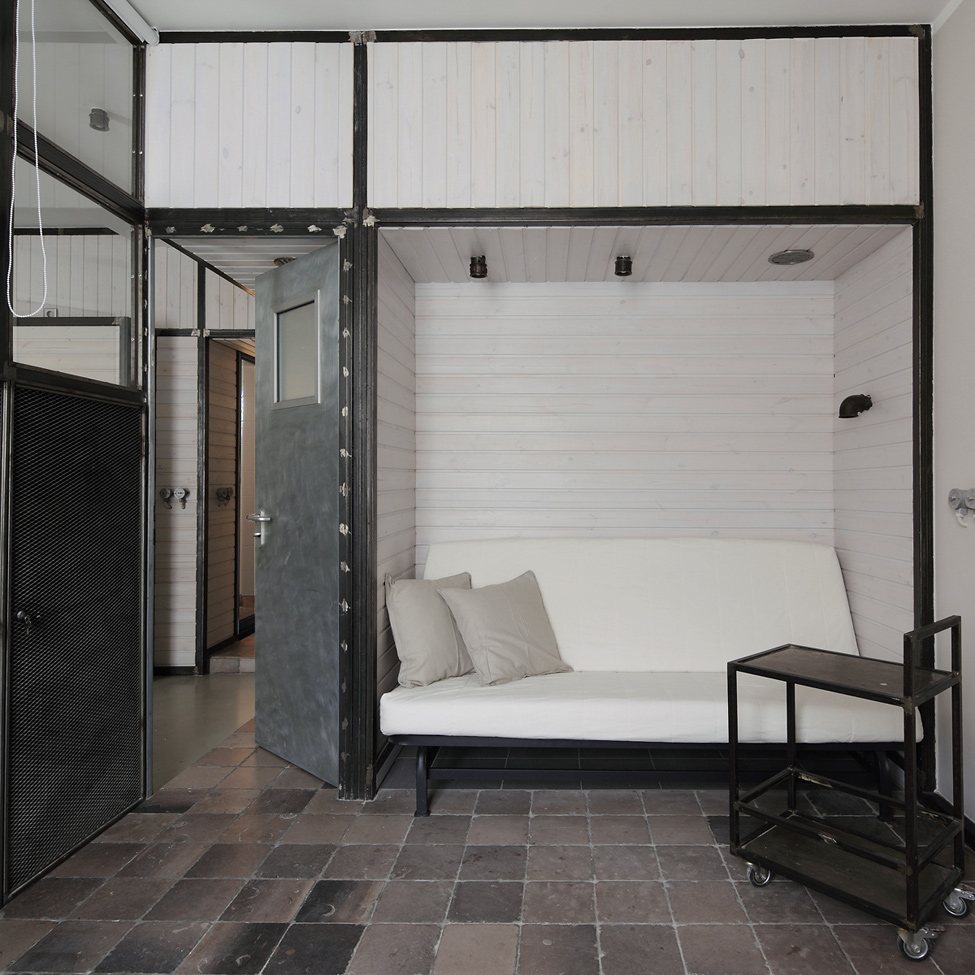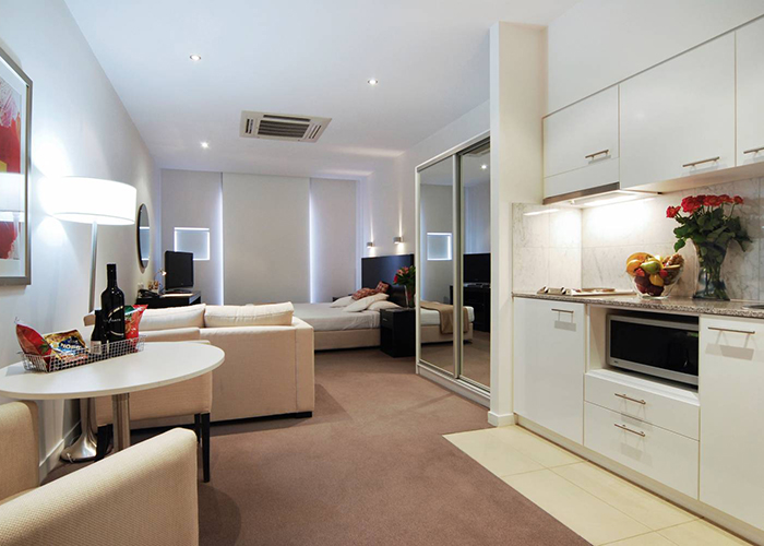 The kitchenette in the niche can be hidden using a partition.
