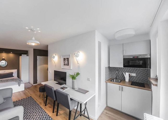 Arrangement one-room apartment with a recess in the wall - a great alternative to a studio apartment. When the dimensions of the partition allow, it’s actually possible to even arrange a cooking area, otherwise there is only enough space for a bar, work surface and mini-sink.