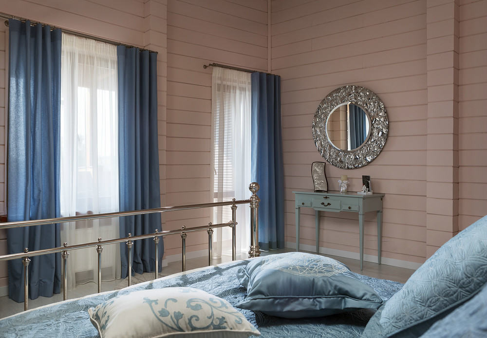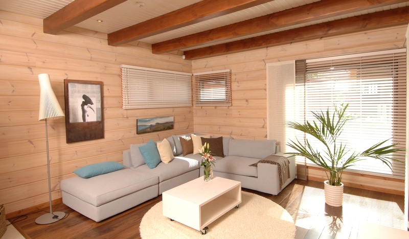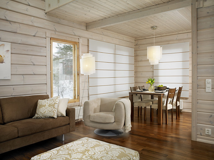Some people prefer to leave the timber inside without decoration. This emphasizes the rustic motif. But you will have to introduce colors during the design. The most suitable are a shade of cognac, gold, pink or olive. Gentle tones are suitable, without a sharp contrast. Especially regarding the design of a summer cottage.