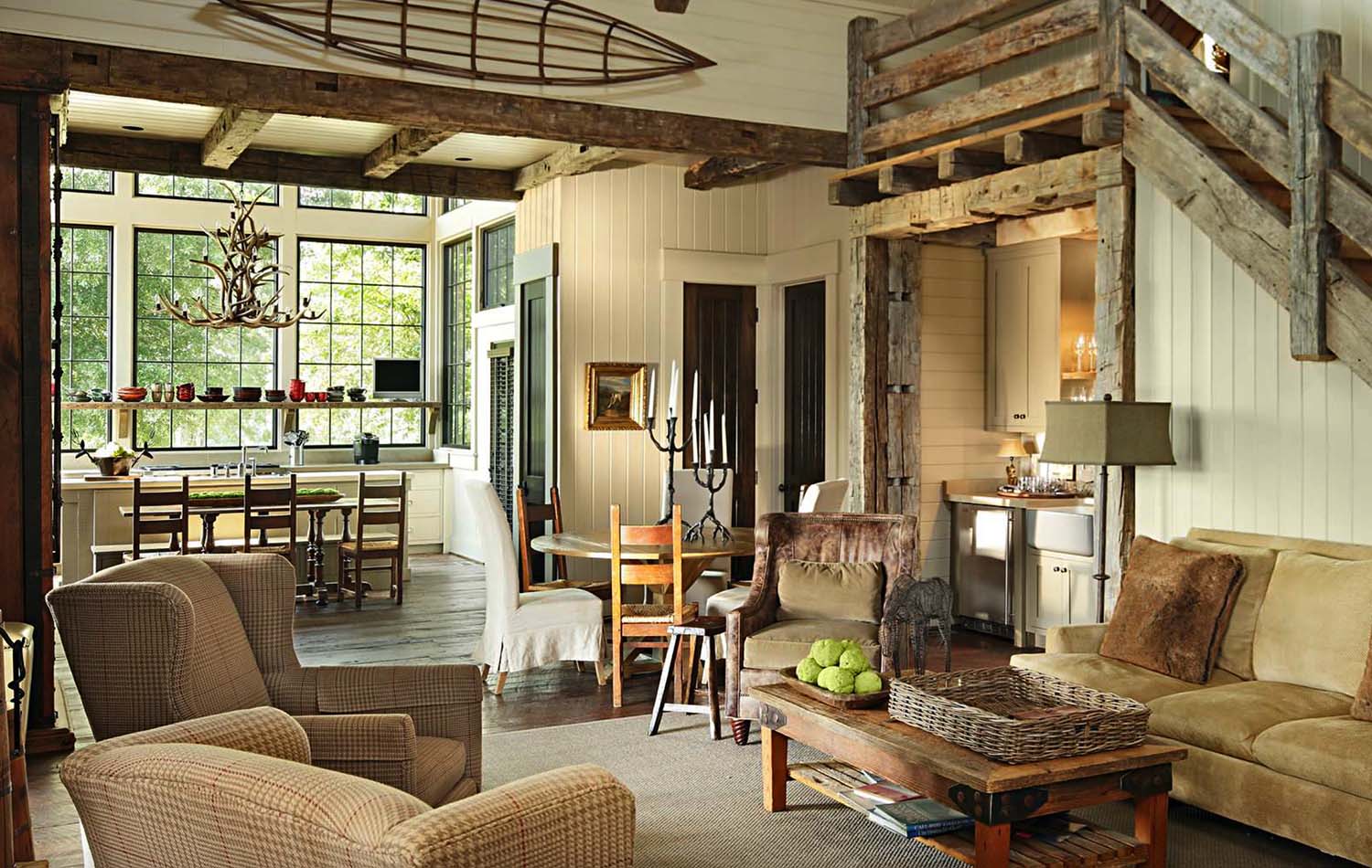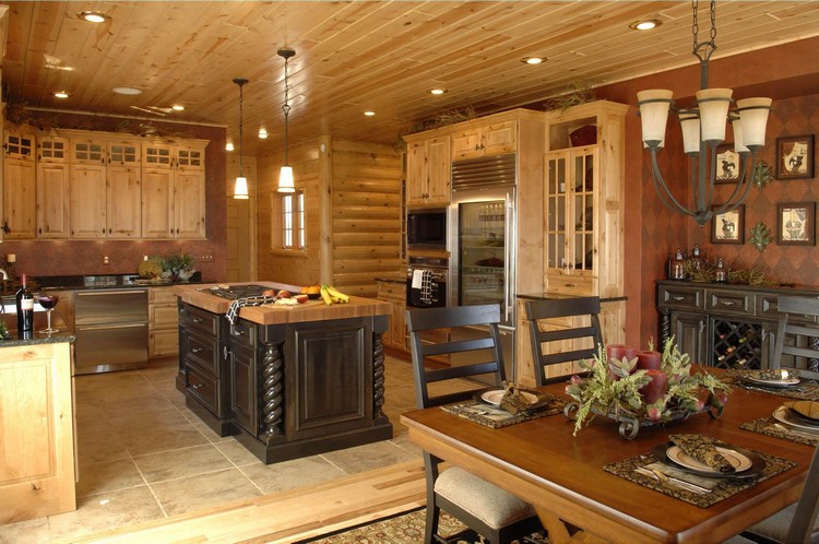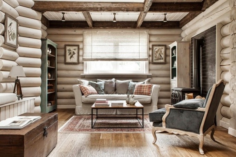 The interior of a wooden house can be decorated with a folk style. This will fit both the American "Country" and the Old Russian version. If you use the cottage only in the summer season, it will be interesting to decorate the interior in the style of a hunting lodge. However, you do not have to be a hunter.