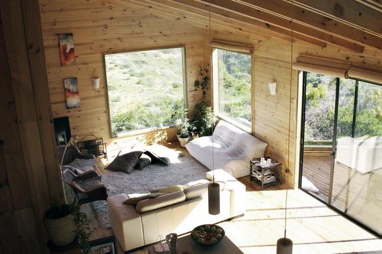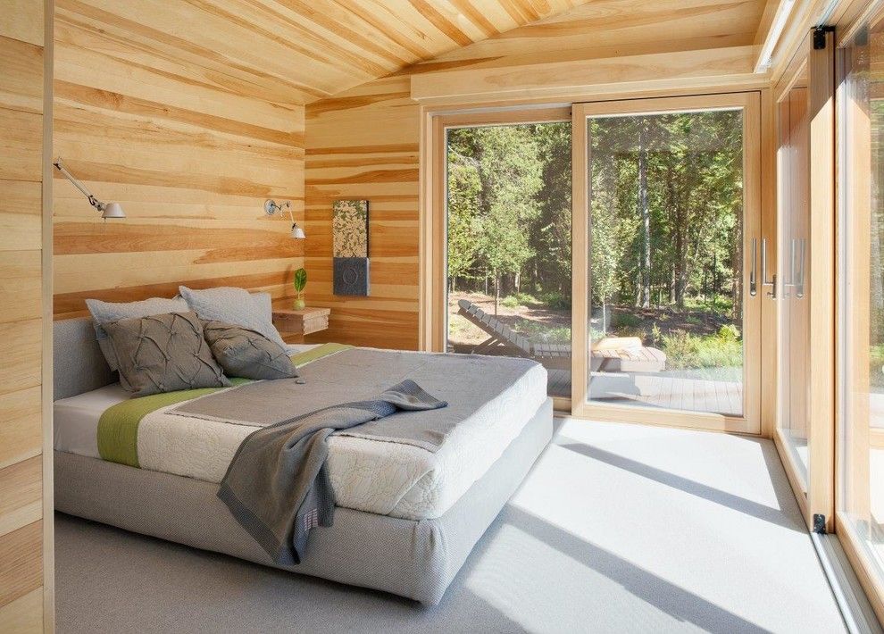 In order for your sleeping place to be more comfortable than the communication area, the crate from the boards inside is painted white. A person is used to perceiving calmer pictures before going to bed. But you can leave the walls and ceiling in the tone of natural wood. For example, birch has a particularly light texture.