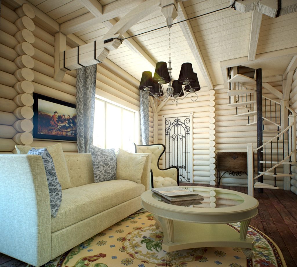 The drawing room is a place where many friends and relatives gather. For a house built of wood, there is an original way to decorate the interior of this room. During the construction of the cottage, the project provides for the layout of a living room with a high ceiling. In the presence of the second floor, the overlap may be completely absent.