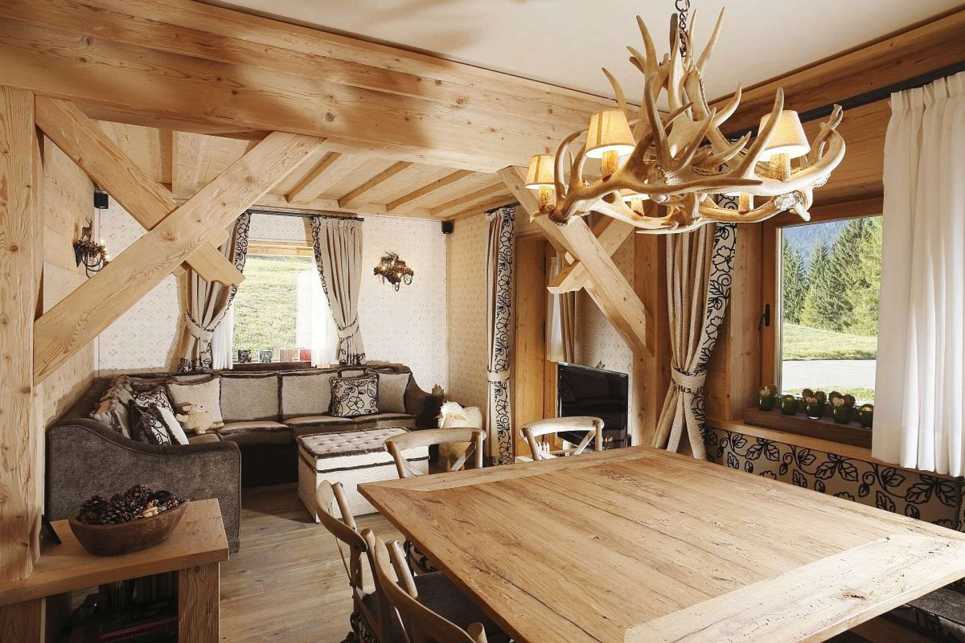 If you will design interior rooms in the style of a hunting lodge, focus on furniture.For example, in the bedroom, be sure to get a massive double bed made of rough processed wood. Use colors predominantly dark. The walls of such a lounge are decorated with stuffed animals, deer horns, shotguns and other relevant elements.