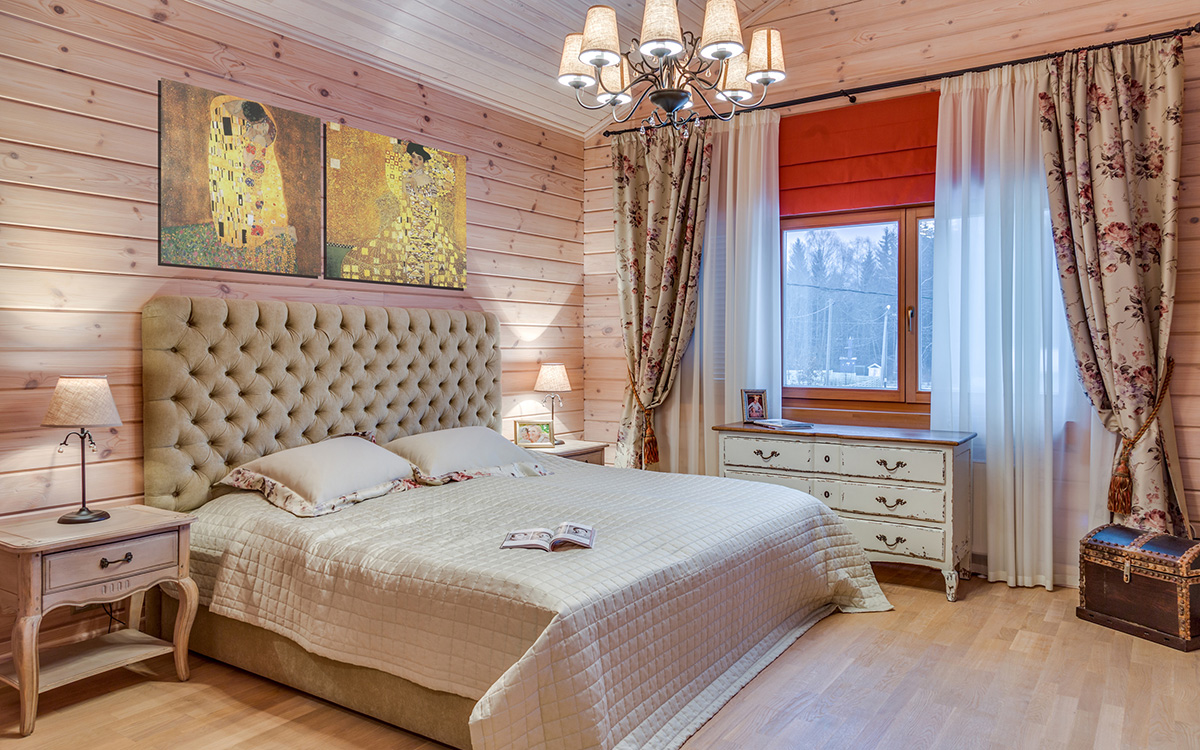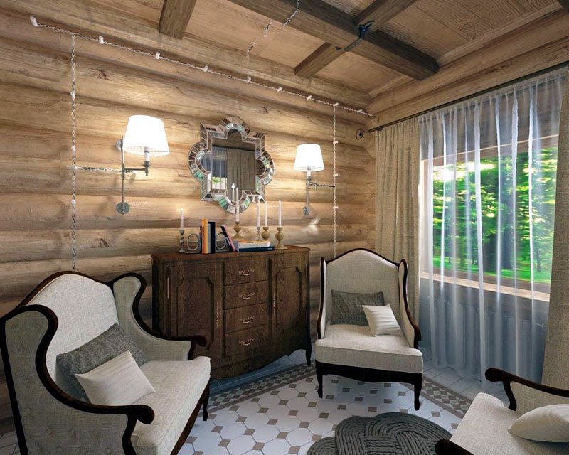 Wooden buildings, lined with wood all the time, suitably look in folk types of design. The “Old Russian” and “American Country” styles mentioned above will harmoniously fit in and complement the structure.