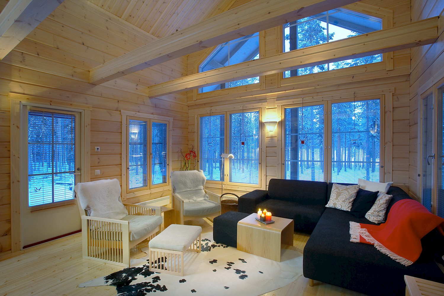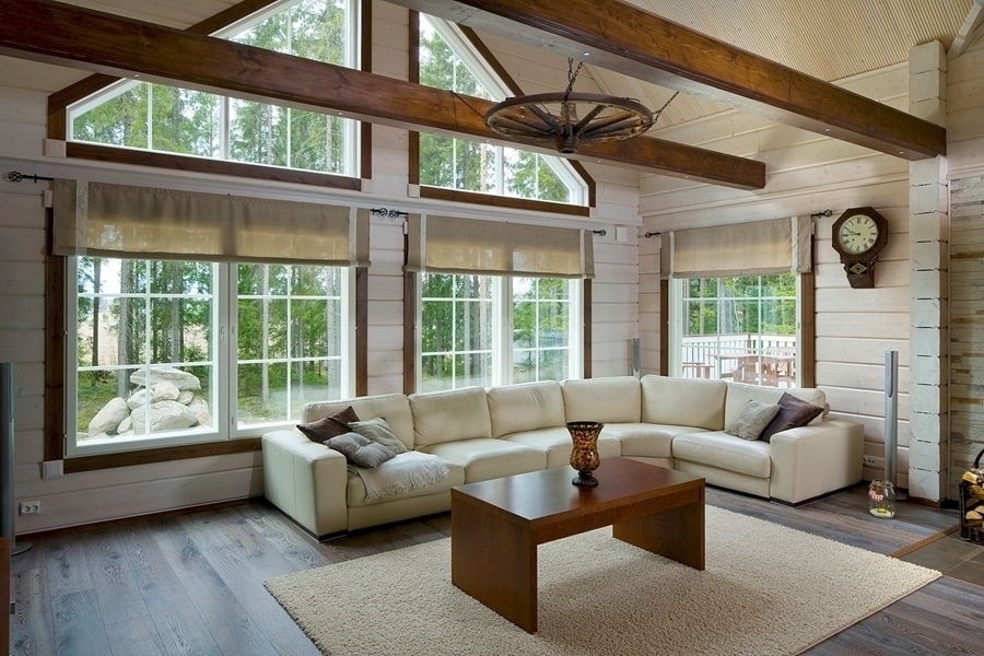 The interior of the living room with panoramic windows often has exposed beams