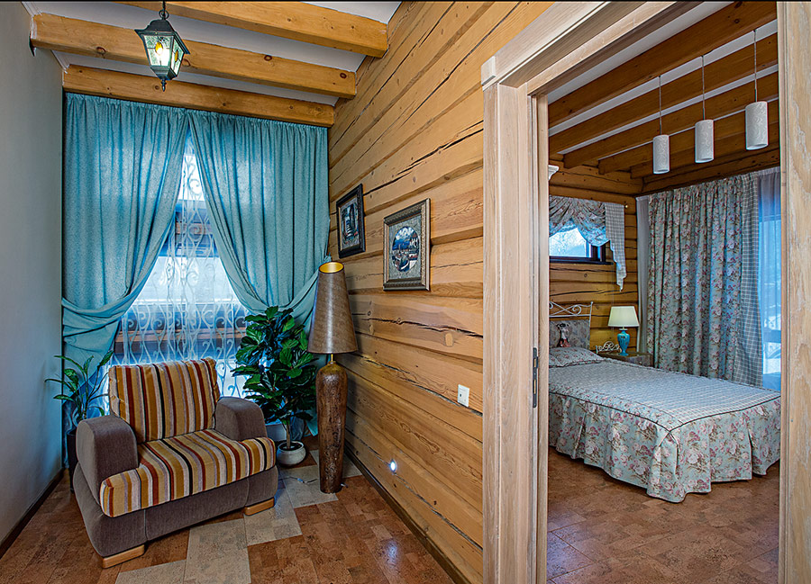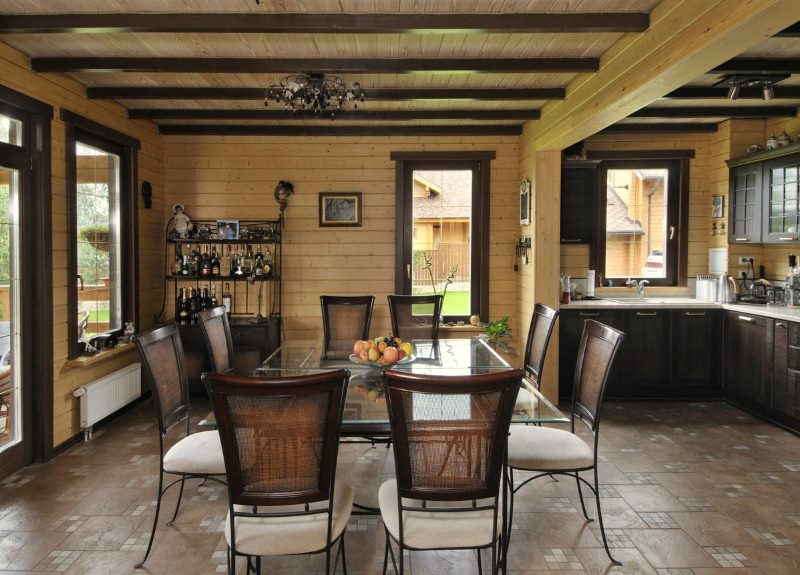 The flooring is covered with a board impregnated with a dark composition. The walls may remain from the bars, but they will have to be saturated with a brown tint of oil. The ceiling space, namely the floor partitions are made of huge logs of trees, roughly polished.