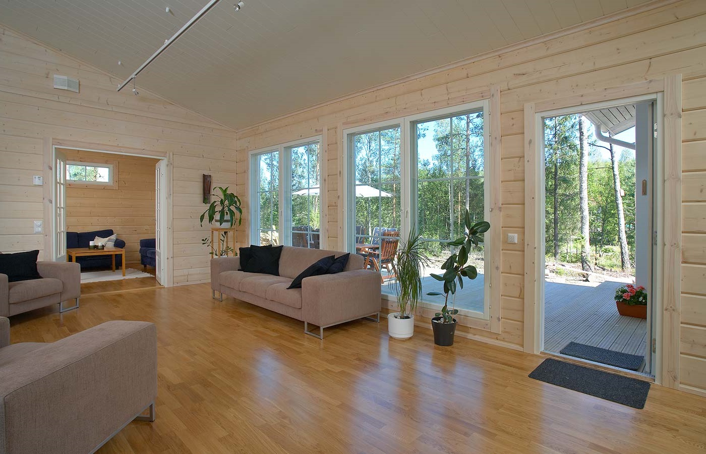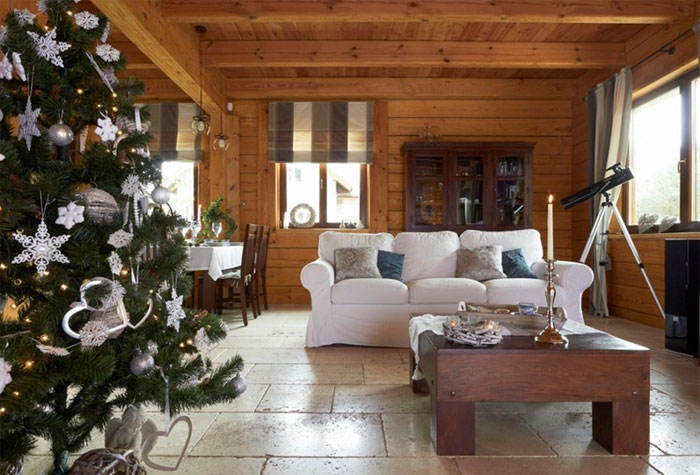 The internal walls of a house made of timber are usually coated with varnish that does not hide the expressiveness of the wooden texture.