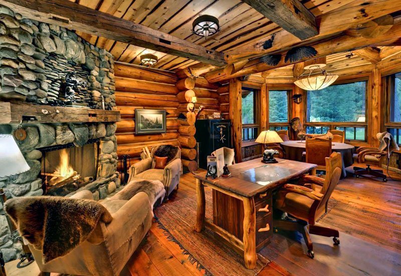 A floor covering made of ceramic tile will look very nice. The hue is selected dark, sharply contrasting with wooden facades. Instead of a carpet, an entire bear skin spreads here. Scarecrow can be purchased in artificial performance.
