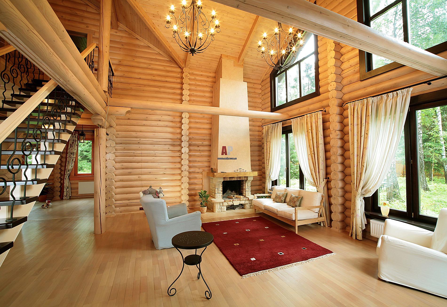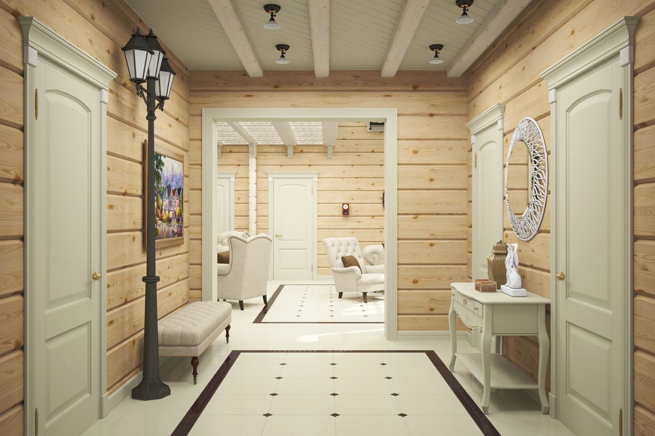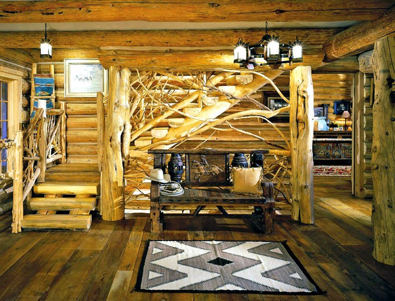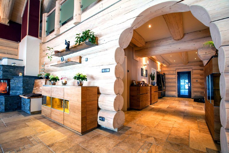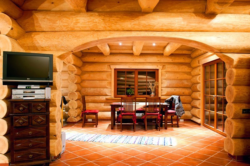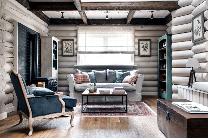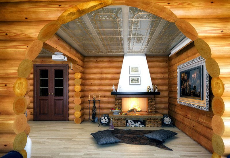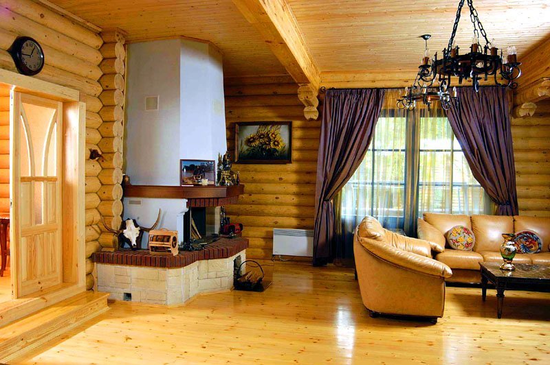The main feature, as well as the difficulty of designing this type of structure, is the widespread use of wood. It is everywhere. Log walls, ceiling (or ceiling, depending on the number of storeys), and even the floor is made of boards. With such an abundance of homogeneous building material, there is a need to diversify the interior decoration.