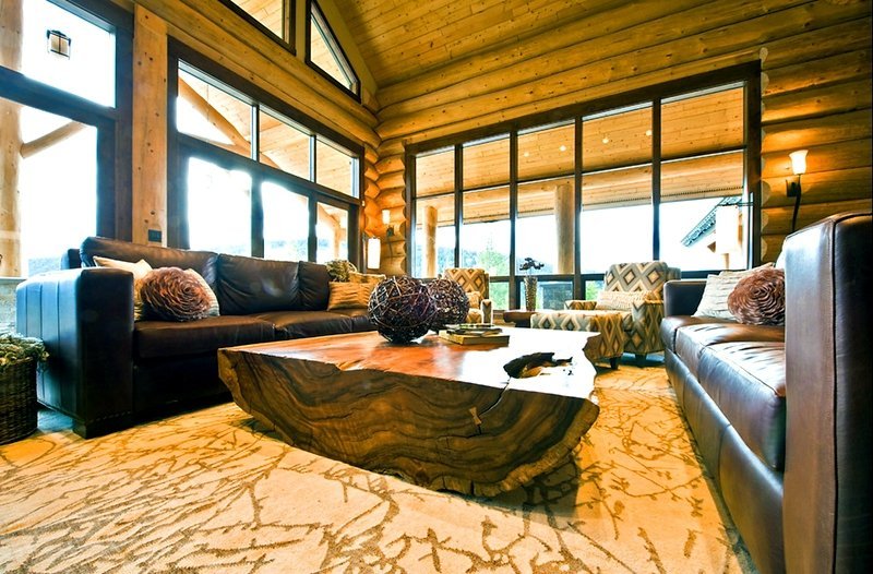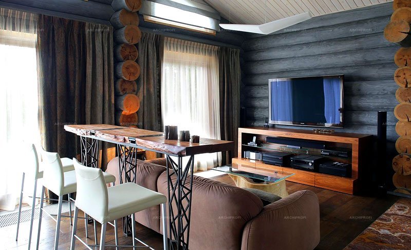 Stylish interior design of the house from round timber