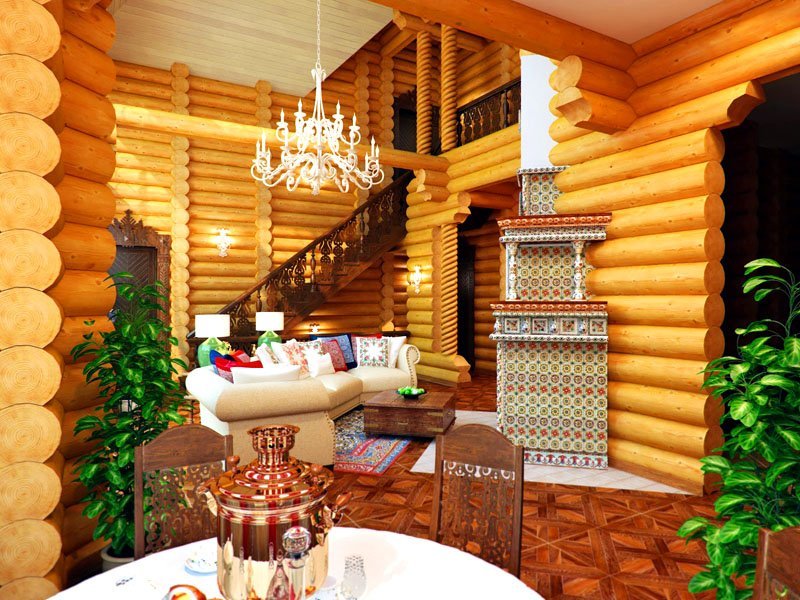 The design of the hall in the style of “Russian hut”