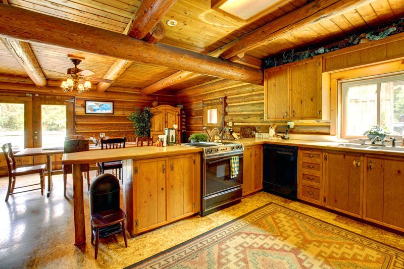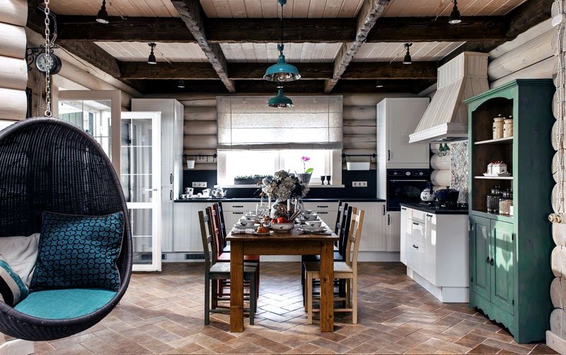 In this country kitchen, the style successfully fits into a traditional Russian log cabin