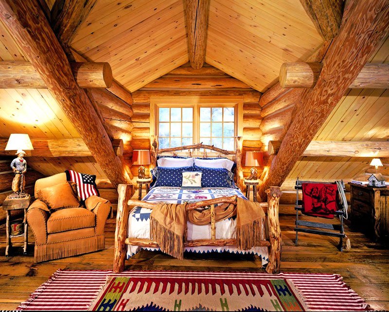It is possible to decorate a cottage with small decorations built from a profiled board. Skins of animals, painted curtains, and folk fringe are also suitable here. Additionally, the floor is covered with a luxurious carpet embroidered with patterns.