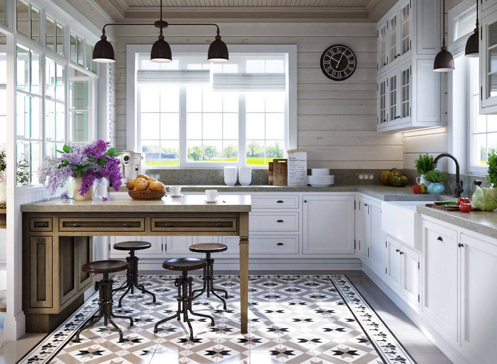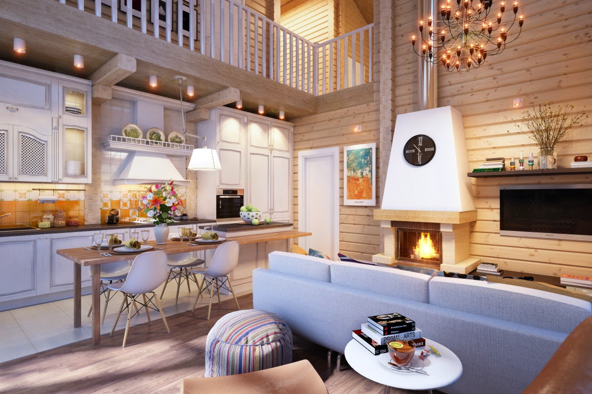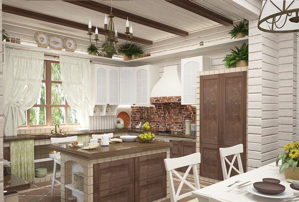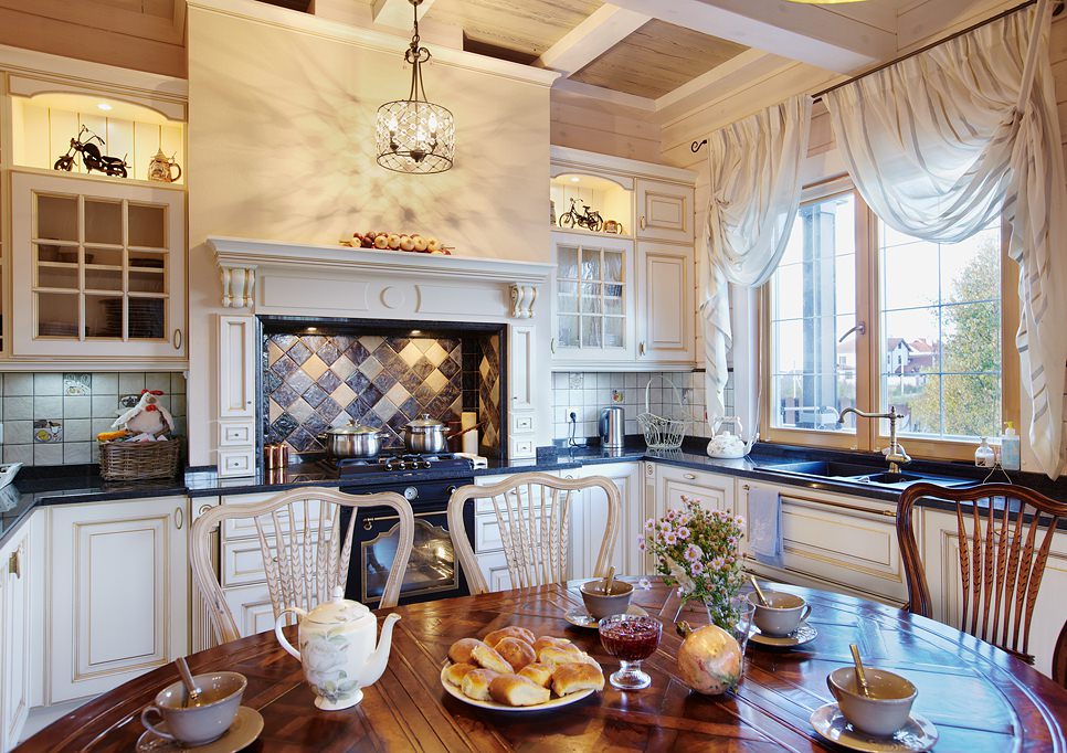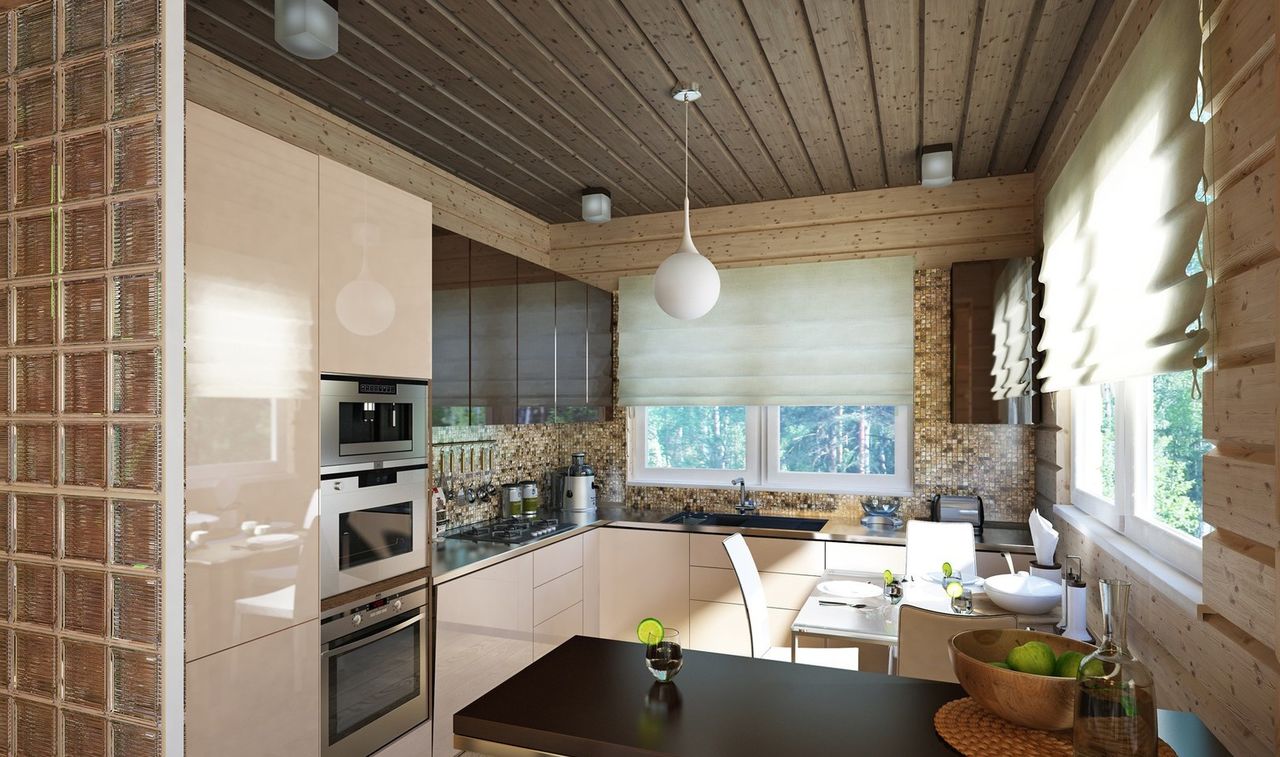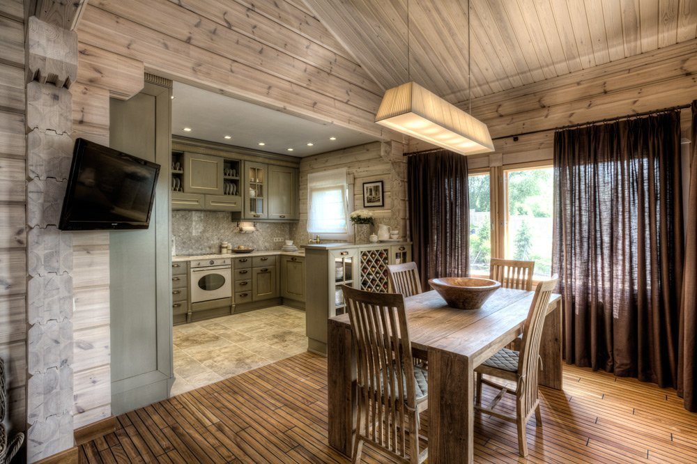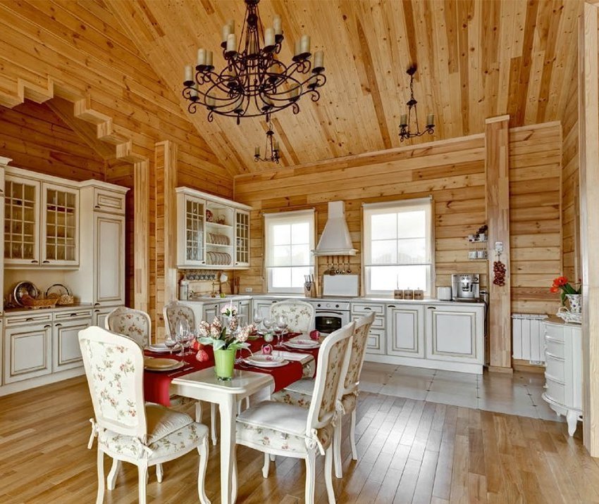 The interior of the house from glued beams looks good in both light and dark versions. French Provence is ideal for the kitchen. The walls are decorated with white matte impregnation, the main element of Provence. Kitchen flooring is best made from moisture resistant material.The tree here will quickly wear out and lose its presentation. Therefore, it is better to use ceramic tiles. It is better to close household appliances with wooden facades. Metal and plastic will be inappropriate here.