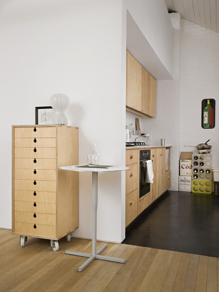 The bedroom is separated from the living room by a lattice partition that allows light to pass into the depths of the room.