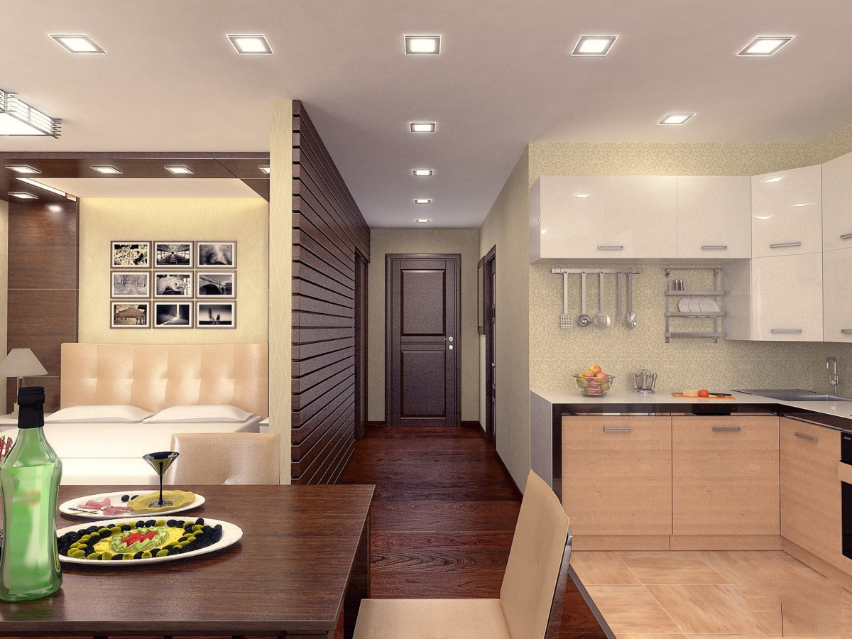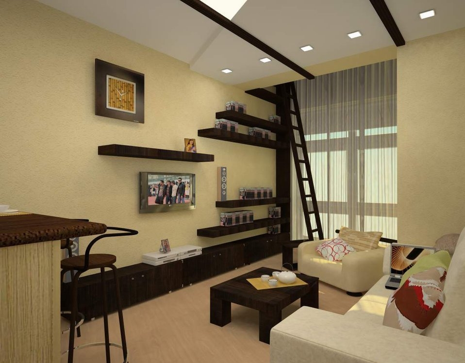 | Colors | To visually increase the space of a studio apartment, pastel shades are used in the design of walls, ceilings and floors, they make the interior light and airy. You can try to combine warm and cold shades, but the selection should be made by a professional. |