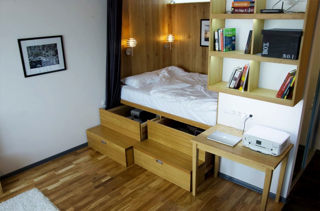 Freedom of choice, thoughts can imply a different lifestyle of the owner of the studio, it depends on him what the interior of the apartment will be. Some will have enough kitchen and sleeping areas, while others need a full living room and office. The possibility of any type of layout is the main advantage of a rectangular room with one window.