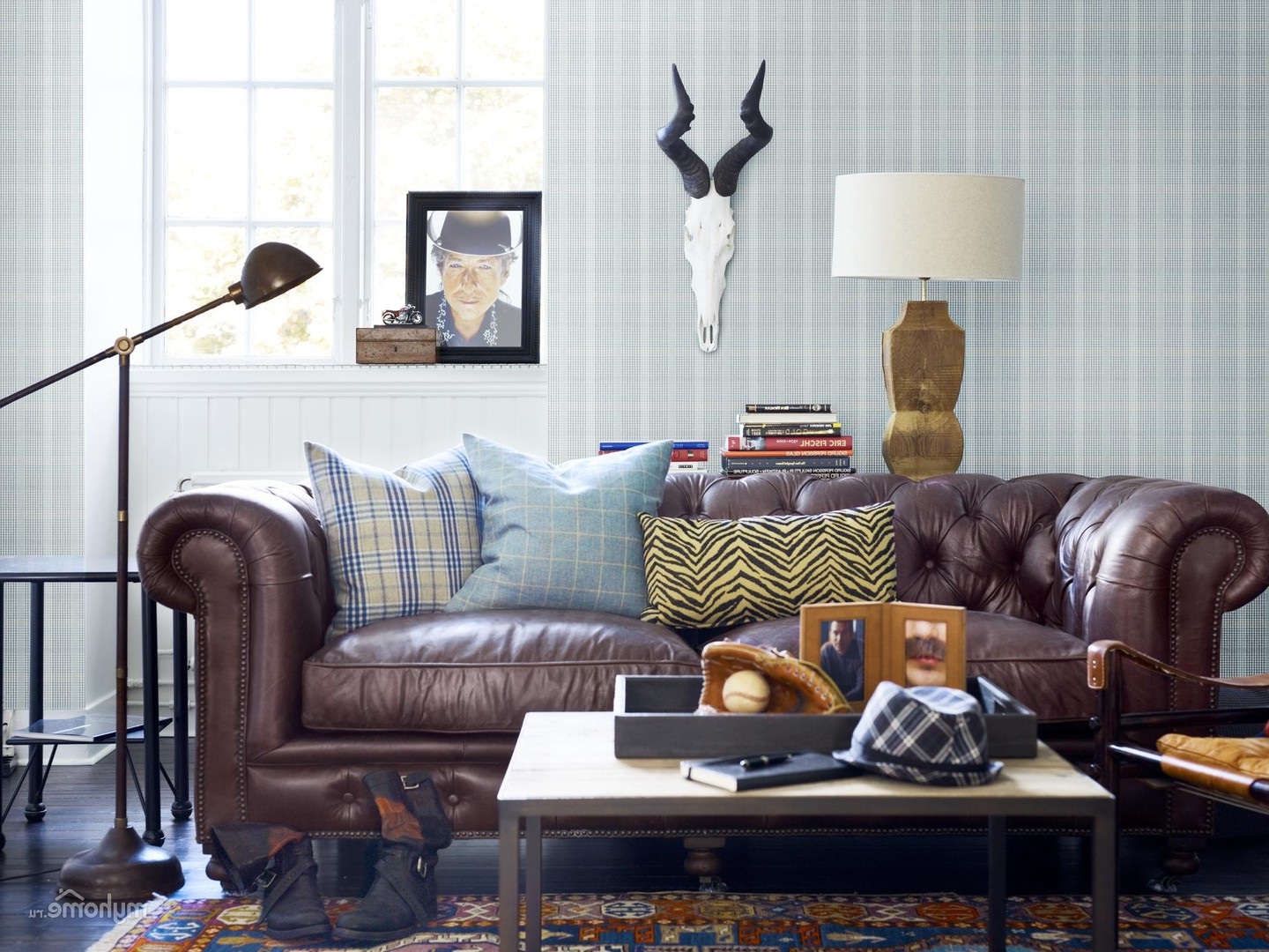 For decor, multi-colored carpets without a long pile or patchwork quilts, which can be done independently, are suitable. The walls are decorated with natural hunting skins, the most striking attribute is a cowboy hat.
