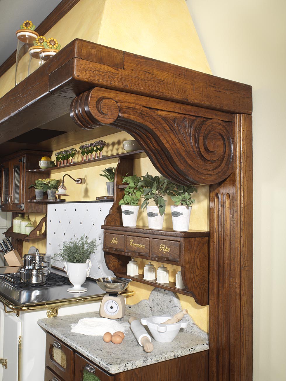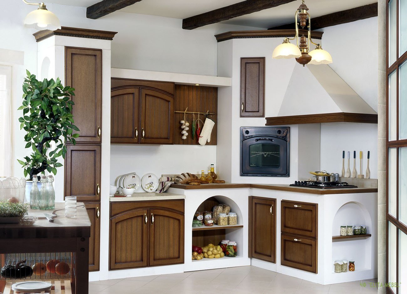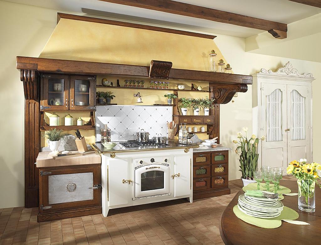 The Italian country style in the interior involves a set of artificially aged wood, polished or with a layer of varnish. Pistachio and cream tones, an abundance of arches and stone prevail.