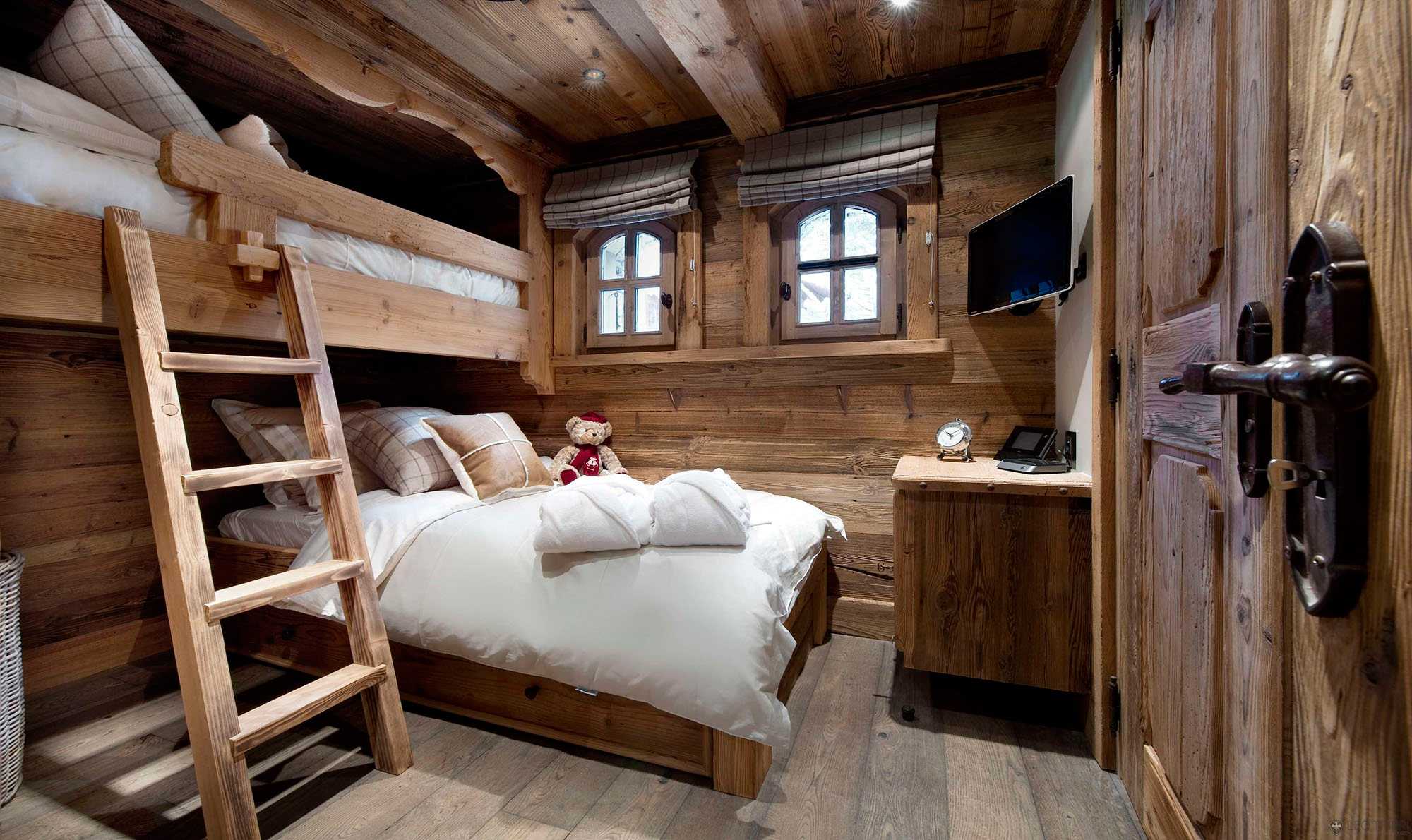 In the bedroom, install massive, but low beds, carefully sanded or varnished furniture. Day curtains will contrast with the weight of linen at night, bed linen with floral patterns can be covered with a blanket stylized as a tapestry depicting a still life, landscape or animal paintings.