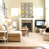 In most living rooms, television is an integral part of life. In this case, it is worth dividing the space in the room into zones. For example, place the fireplace on the other side or wall of the room, separating this area with a coffee table and one or two armchairs, placing a vase of flowers. A fireplace-TV combination is allowed when the fireplace is located under the TV.