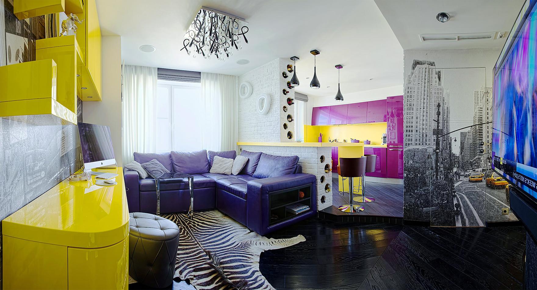 Lilac, pink, deep yellow - in the living room there is a typical color palette for kitsch