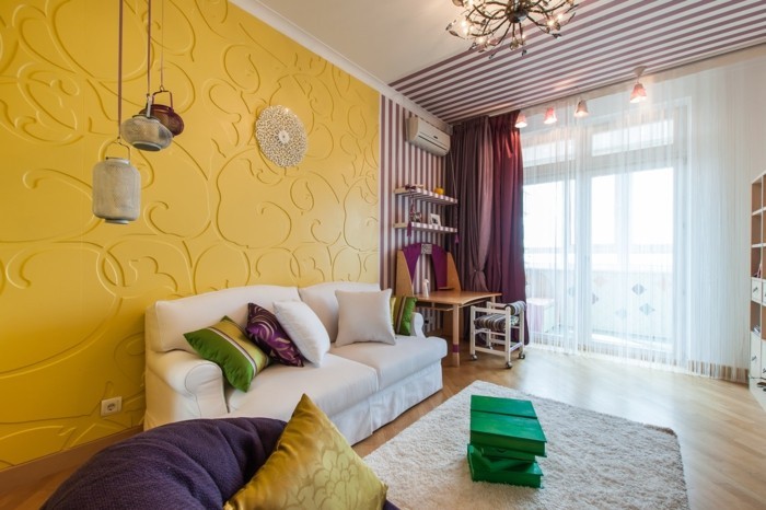 Gray, lilac or beige as a companion to the yellow range is rarely of interest to most failed personalities.For them, experts recommend a combination of yellow wallpaper with other colors, especially with white ceilings, brown furniture and spectacular wood finishes.