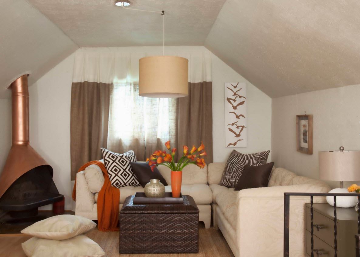 The first thing that matters is form premises. It usually has a beveled low ceiling. This determines the choice of furniture, lamps and scenery.