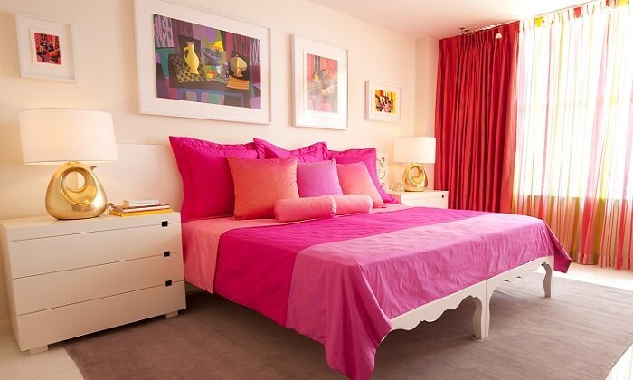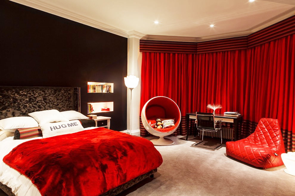 Textiles are the most favorable area for implementation. In the bedroom, color is realized in curtains, upholstery and bedding. This is a great option. Scarlet curtains will add freshness and spaciousness, if you choose darker - comfort.