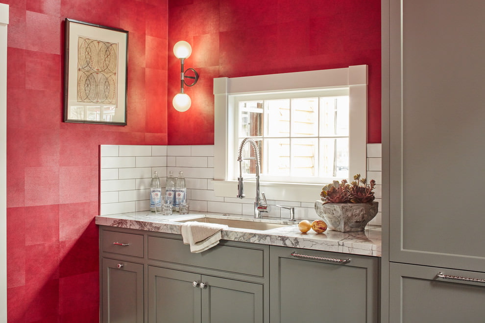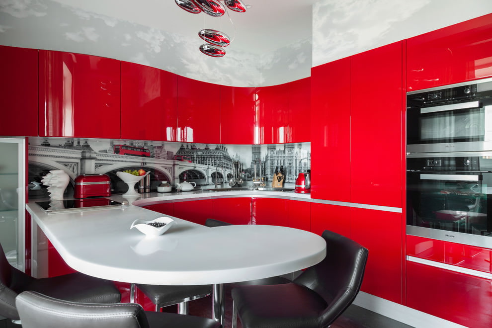 Gray will also create a great pair. It will calm the stormy fiery, make it more matte and noble. The combination with black will be a real expression of passion and extreme contrast. This option is suitable for a kitchen set.